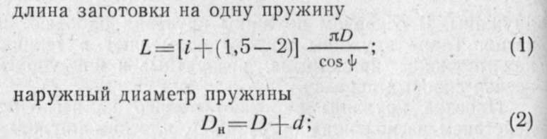 Приняты следующие условные обозначения параметров пружин (рис. 58) и заготовок. L — длина заготовки на одну пружину, мм; d — диаметр заготовки, мм; б — зазор между витками, мм; г|) — угол подъема витков в градусах; i— число рабочих витков; D — средний диаметр пружины, мм; К — осадка пружины (стрела прогиба), мм; DB — наружный диаметр пружины, мм; DB — внутренний диаметр пружины, мм; t — шаг пружины, мм; Н0 — свободная высота пружины, мм; #а — высота пружины при полном сжатии, мм.